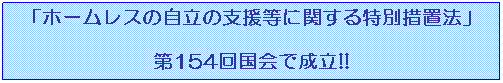「ホームレスの自立の支援等に関する特別措置法」が、第154回国会会期末ぎりぎりの7月31日、参院厚生労働委員会で可決され、参議院本会議で追加議案として提案されて、投票の結果反対票ゼロで可決されました。